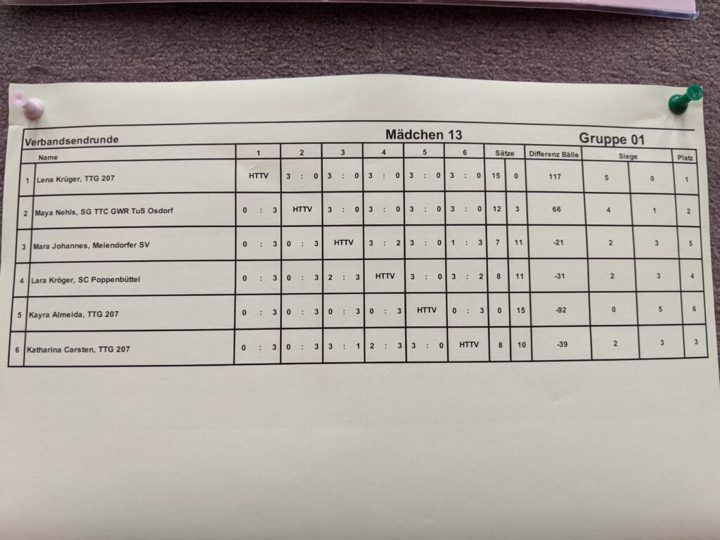 Das letzte Spiel konnte sie glatt mit 3:0 gewinnen. Nun mussten wir aber auf das Ergebnis der Konkurrenz warten und es kam leider sehr unglücklich für Mara, bei 3 Spielerinnen mit 2 Siegen hatte sie das schlechteste Satzverhältnis. Im Platzierungspiel gewann sie klar mit 3:0 und erreichte mit insgesamt 3 Siegen den 9. Platz.