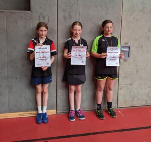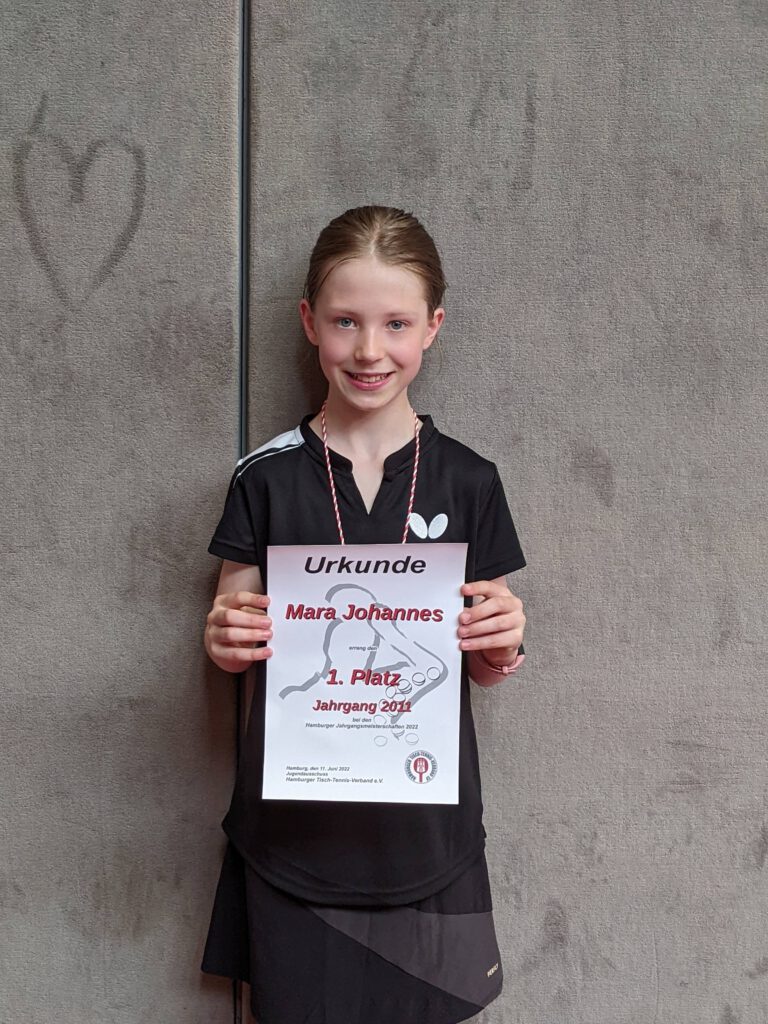 Mara Johannes, Jg. 2011, war an 3 gesetzt, es spielten alle 7 Mädchen jeder gegen jeden. Die ersten 4 Spielerinnen hoben sich schon sehr von dem übrigen 3 ab und am meisten Mara! Sie schlug hintereinander erst ihre Dauergegnerin Lara von Poppenbüttel klar mit 3:0, dann die an 1. gesetzte Spielerin von St. Pauli mit 3:2 und sehr erschöpft kämpfte sie auch noch 3:0 die Drittplatzierte von Finkenwerder nieder. Somit 6:0 Siege und die Hamburger Jahrgangsmeisterschaft!