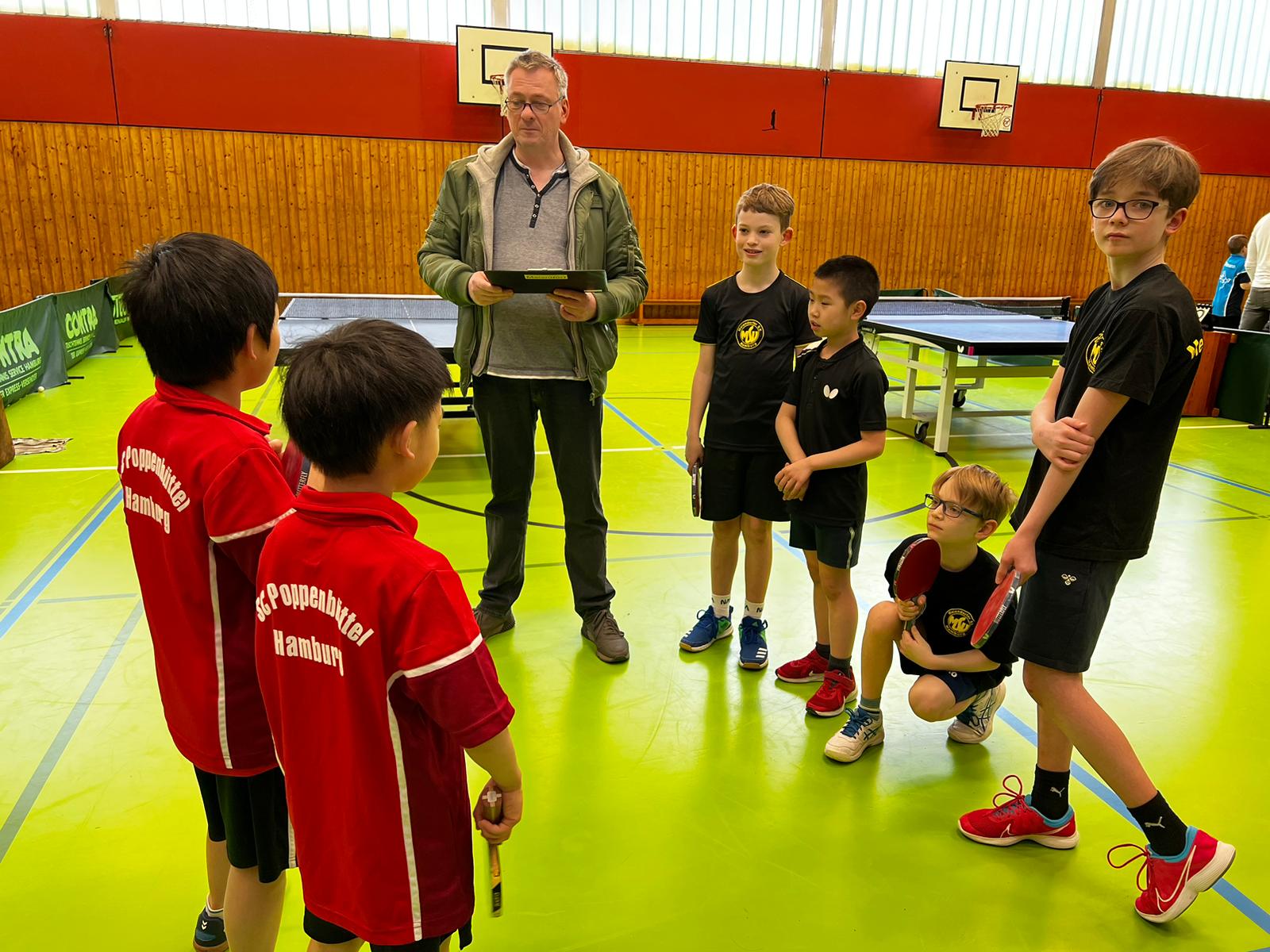 Mit etwas Verspätung begann danach das Spiel gegen TTG 207 Ahrensb./Großhansd. VI. Für Thies wechselte Max wie vorher abgesprochen ins Team. Da auch die Gegner zu viert antraten, wurden 2 Doppel ausgetragen. Max und Allen gewannen sehr knapp im 5. Satz, Willem und Melvin mussten im ersten Satz bis 21:19 spielen, und gewannen dann ihr Doppel 3:0!