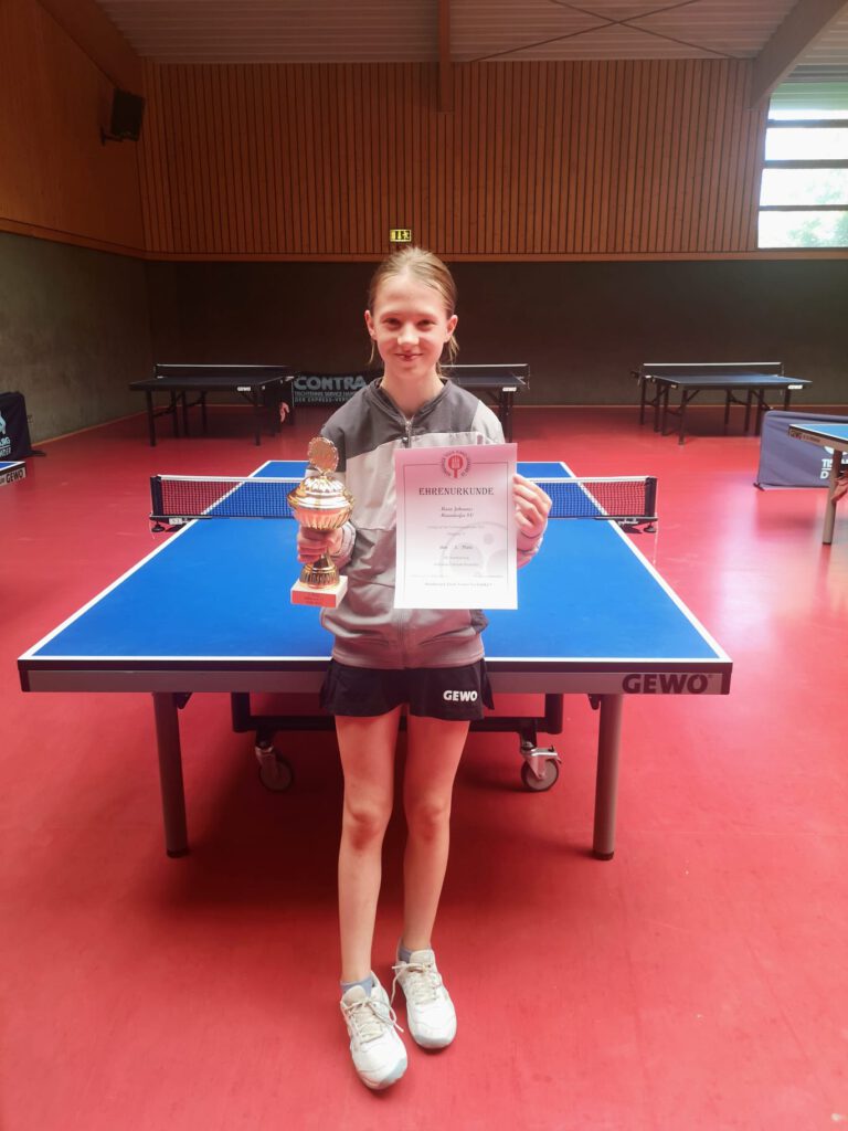 Mara, gut gelaunt, sehr gut von Tobias eingespielt und von Nathalie betreut, spielte von Anfang an ein tolles Turnier: In der Gruppe konnte sie sich trotz einer hauchdünnen Niederlage durch die anderen klaren Siege als Erste durchsetzen. In den Platzierungsspielen gewann sie nochmal das erste Spiel klar, verlor allerdings das allerletzte Spiel. Dadurch, dass sich die Konkurrenz gegenseitig geschlagen hatte, konnte sie niemand mehr vom 1. Platz verdrängen. Mara gewinnt zum ersten Mal dieses wichtige Turnier in qualifiziert sich damit für die Norddeutsche Rangliste am 23.+24.9. in Brandenburg!