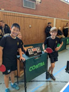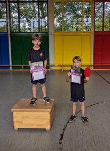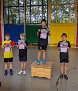 Jakob Heinze trainiert schon etwas länger bei uns und gewann mit sehr guten VH-Schlägen (VH bedeutet Vorhand) gegen seinen Bruder Konrad, der aber auch gerade gegen die anderen Kinder sehr gut mitgespielt hat.