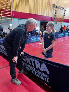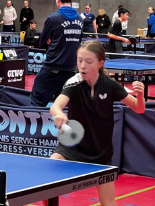 Mara war bei heute bei den älteren Mädchen, in der U15 Klasse am Start. Es begann mit Mixed, wo sie leider mit ihrem Niendorfer Mixedpartner Ben knapp im 5. Satz verlor. Im Doppel verlor sie mit Carolina aus Wellingsbüttel nur knapp 1:3 gegen die späteren Hamburger Meisterinnen!