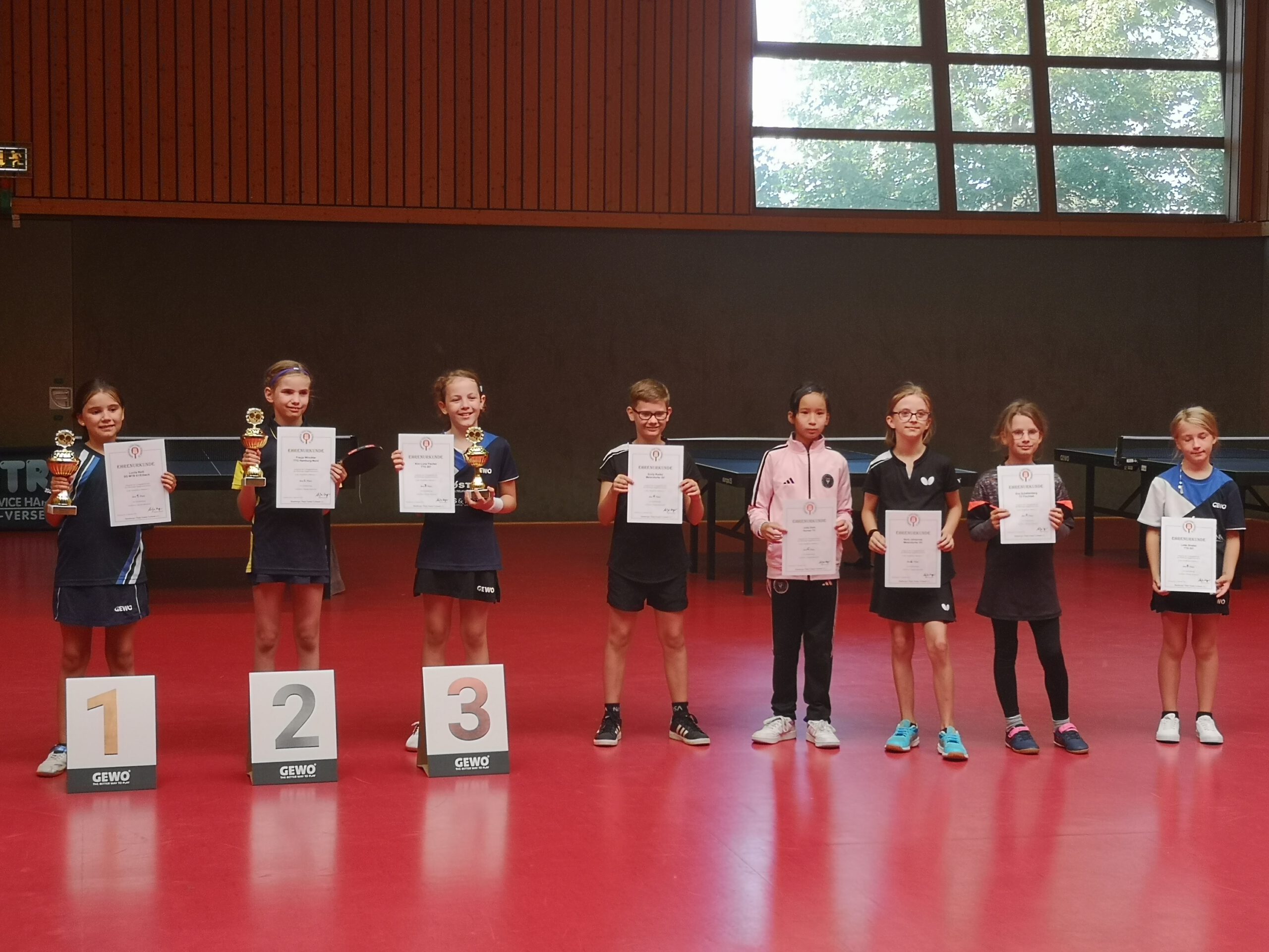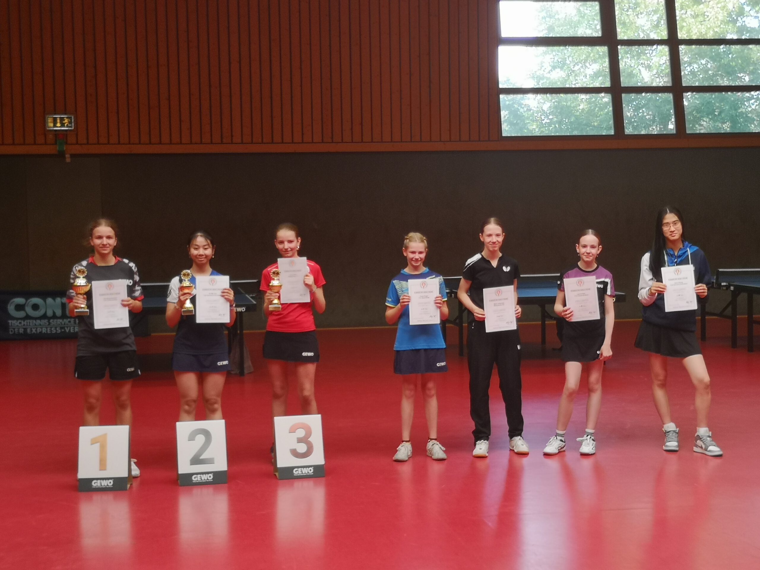 Bei den Mädchen U11 starteten in einem 9er Feld Emily und Nora. Nora konnte 3 der 8 Spiele für sich entscheiden und belegte den 6. Platz. Emily belegte sogar Platz 4 bei einer 5:3-Bilanz. Bei ein wenig mehr Spielglück wäre sogar noch mehr drin gewesen, Nora verlor denkbar knapp gegen die fünftplatzierte Dinh mit 2:3, und auch Emily musste erst im 5. Satz der späteren zweitplatzierten Winckler gratulieren.