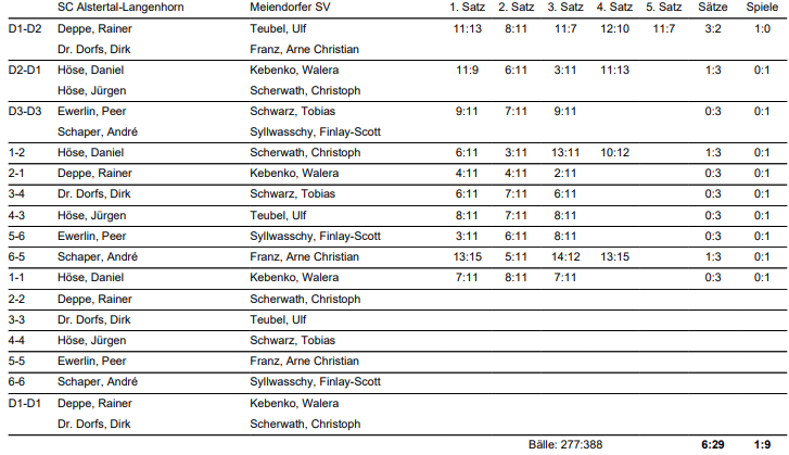 - Ulf und Arne führten 2:1 und 10:9, verloren das Spiel gegen Rainer Deppe und Dirks Dorfs aber leider noch im 5ten Satz.